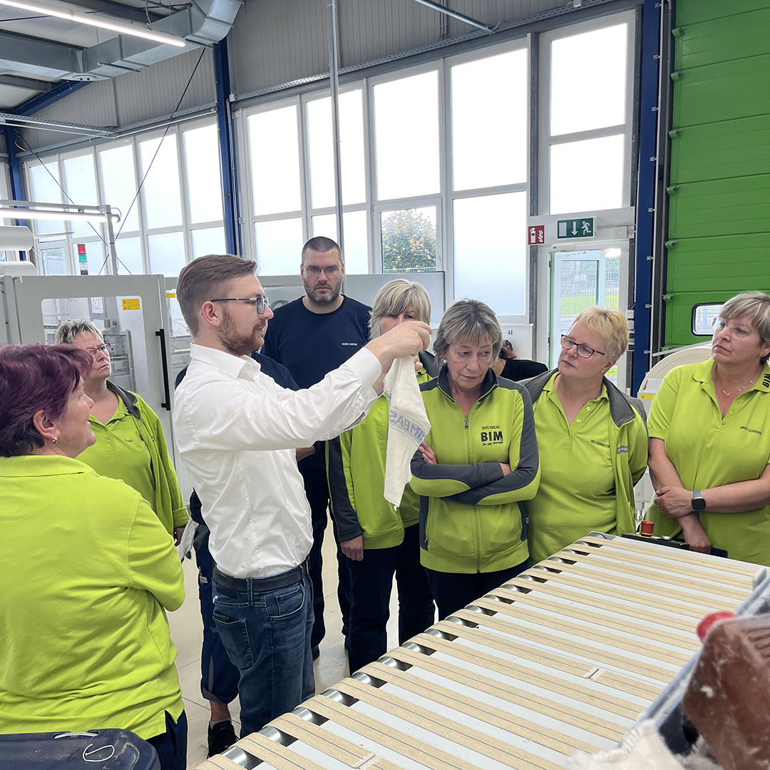 Unsere Mitarbeiter aus dem Textilmietservice waren - geführt von Produktionsleiter Niklas Wagner - auf Erkundungstour bei den Kollegen im Putztuchbetrieb. Und das nicht ohne Grund. Schon mehrfach war der Wunsch geäußert worden, sich die anderen Betriebsbereiche einmal anschauen zu können, zumal die Fertigungsbereiche auf dem Firmengelände räumlich getrennt sind.