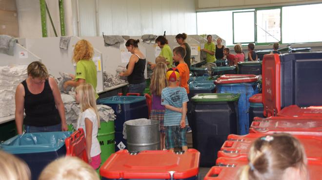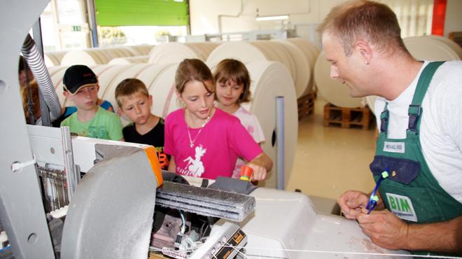 Die Hortkinder konnten während der Führung durch den BIM-Chef persönlich in allen Abteilungen viel zum Staunen finden und unter den achtsamen Augen der Mitarbeiter-Eltern auch einmal eine Webmaschine "selbst bedienen". Die riesigen Webstühle in der Weberei, die großen Industriewaschmaschinen im Mietservice aber auch die Unmengen gewaschener Putztücher, die die meterlange Waschstraße im Putztuchbetrieb regelmäßig aus ihrem Inneren freigibt, zauberten den Kindern große Augen in ihre Gesichter und waren von so manchem "Ooohhh" begleitet.