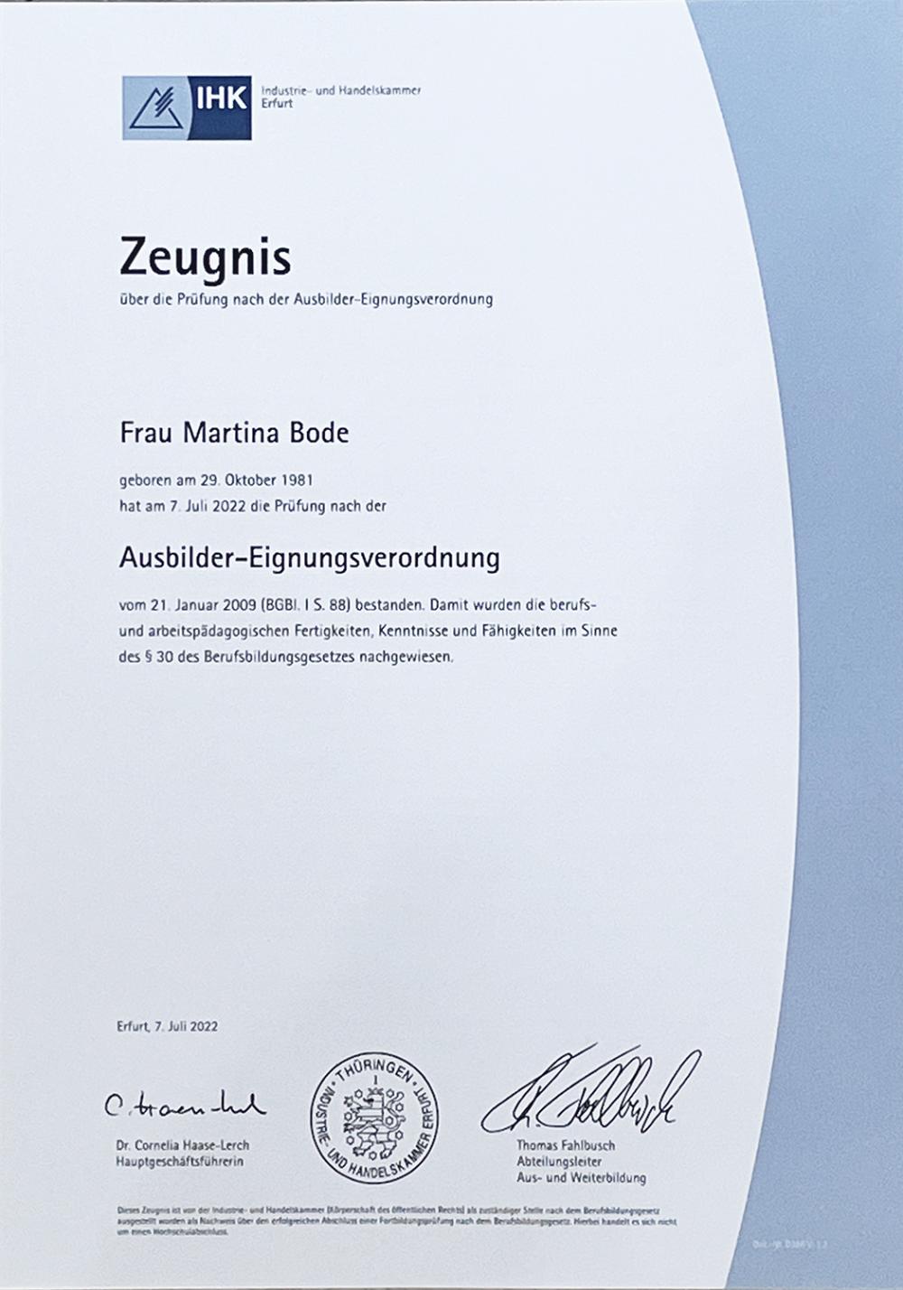 Martina Bode hat alle Kenntnisse und Fähigkeiten nach der Ausbilder-Eignungsverordnung nachgewiesen und darf nach bestandener IHK-Prüfung die Ausbildung des Fachkräftenachwuchses in der BIM-Verwaltung übernehmen. Herzlichen Glückwunsch!