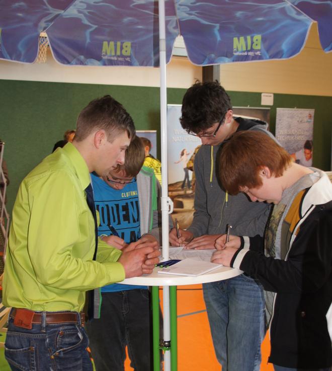 Martin Wagner wurde auf dem Berufemarkt von Stefan Hilmes, Leiter der BIM Produktion Mietservice, und von René Ißleib, Mitarbeiter in der Produktion Mietservice, begleitet. Beide betreuen den BIM-Stand schon seit Jahren mit und sind aufgeschlossene Gesprächspartner für die jungen Leute in den Schulen und ihre Eltern. Die beiden jungen Männer können insbesondere von ihrem eigenen beruflichen Werdegang berichten - von der Zeit in der Ausbildung bis hin zu den Möglichkeiten, sich im Unternehmen BIM weiterzuentwickeln.