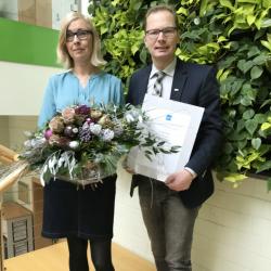 Christine Bode erhielt zu ihrem 25-jährigen Betriebsjubiläum herzliche Glückwünsche von BIM Geschäftsführer Martin Wagner. Die Assistentin der Geschäftsführung hat bereits ihre Tätigkeit noch am ursprünglichen Standort in Bosserode aufgenommen. "Vom ersten Tag an kennen wir Sie als sehr zuverlässige Mitarbeiterin, die auch mit kniffligen Aufgaben zurecht kommt", betonte Martin Wagner. Die langjährige Betriebszugehörigkeit zeige auch, in welcher Weise sich Mitarbeiter im Familienunternehmen BIM entwickeln können. Christine Bode hat Aufgaben in der Buchhaltung und im Controlling übernommen sowie eine ganze Reihe Sonderprojekte.