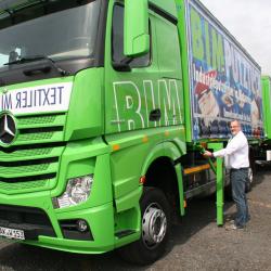 Das Grün des jüngsten Mitgliedes unseres Fuhrparkes hat wohl doppelte Bedeutung: als Unternehmensfarbe und für die Abgasnorm. Es ist unser erster Lkw mit EURO-6-Norm und der erste mit Wechselbrücken. Mitte Juni konnte Verkehrsleiter Andreas Schinke beim Hersteller Mercedes den achten Lkw für die BIM Flotte in Empfang nehmen. „Das Fahrzeug vereint höchsten technischen Standard mit Komfort für unseren Fahrer“, sagt Andreas Schinke und zählt einige Details auf. Mit der EURO-6-Norm ist ein echter Schritt zur Reduzierung von CO2 verbunden. „Wir sparen über 5 Prozent Kraftstoff, weil die Abgase nicht direkt in den Auspuff geleitet, sondern zuvor noch einmal verbrannt werden.“ Und: Die Anlage ist gewichtsneutral. Die Verbrennungstechnik bringt nicht noch einmal, wie bei Vorgängersystemen, Gewicht an Bord.