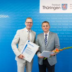 Wirtschaftsminister Uwe Höhn überreicht Martin Wagner Teilnahmeurkunde am NAT Thüringen
