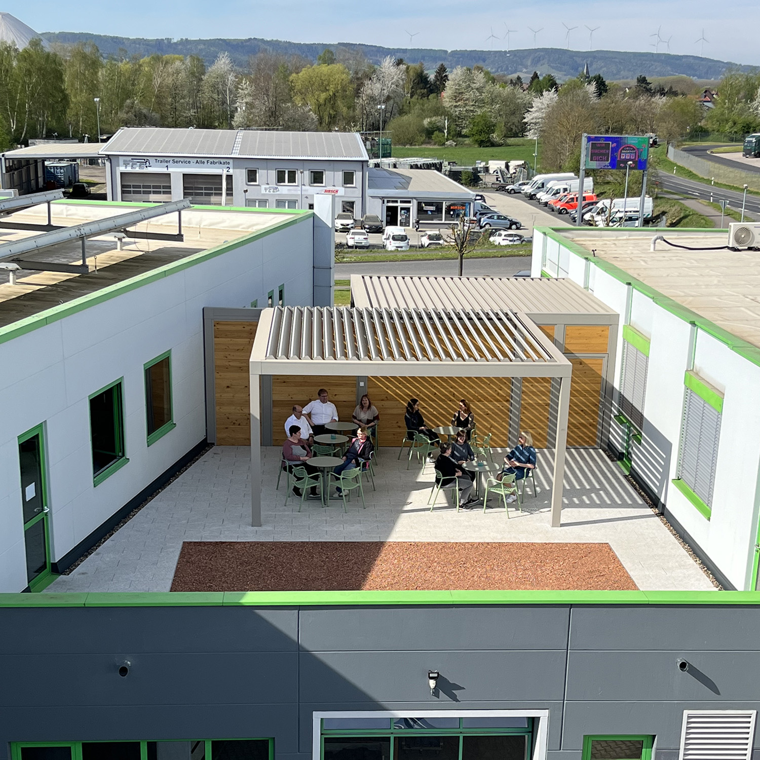 Unsere neue Terrasse verbindet mehr als nur zwei Betriebsgebäude. Unsere Mitarbeiter verbinden damit ab sofort ein lauschiges Plätzchen zum Auftanken in den Pausen - an der frischen Luft, in sehr angenehmer Lounge-Atmosphäre und mit Sitzplätzen, um bei passendem Wetter das Essen einzunehmen.