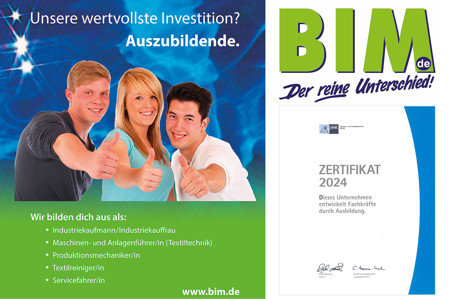 IHK-Zertifikat für Ausbildung bei BIM: Auch für das Jahr 2024 hat die Industrie- und Handelskammer Erfurt unseren Betrieb zum Ausbildungsbetrieb zertifiziert, in dem Fachkräfte durch Ausbildung entwickelt werden.