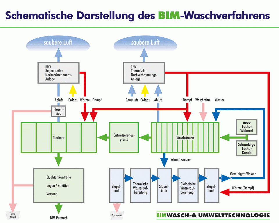 BIM hat sich Sauberkeit als Dienstleistung auf die Fahne geschrieben. Wir arbeiten mit innovativer Technik: Zwei hochmoderne Waschstraßen, die umweltschonende Wasserrückgewinnungsanlage, eine Regenerative Nachverbrennungsanlage und der BIM-Kreislauf garantieren unser Leistungsvermögen als moderner Textildienstleister und sind gleichzeitig unsere stabile Basis für das Arbeiten mit Kunden und Lieferanten.