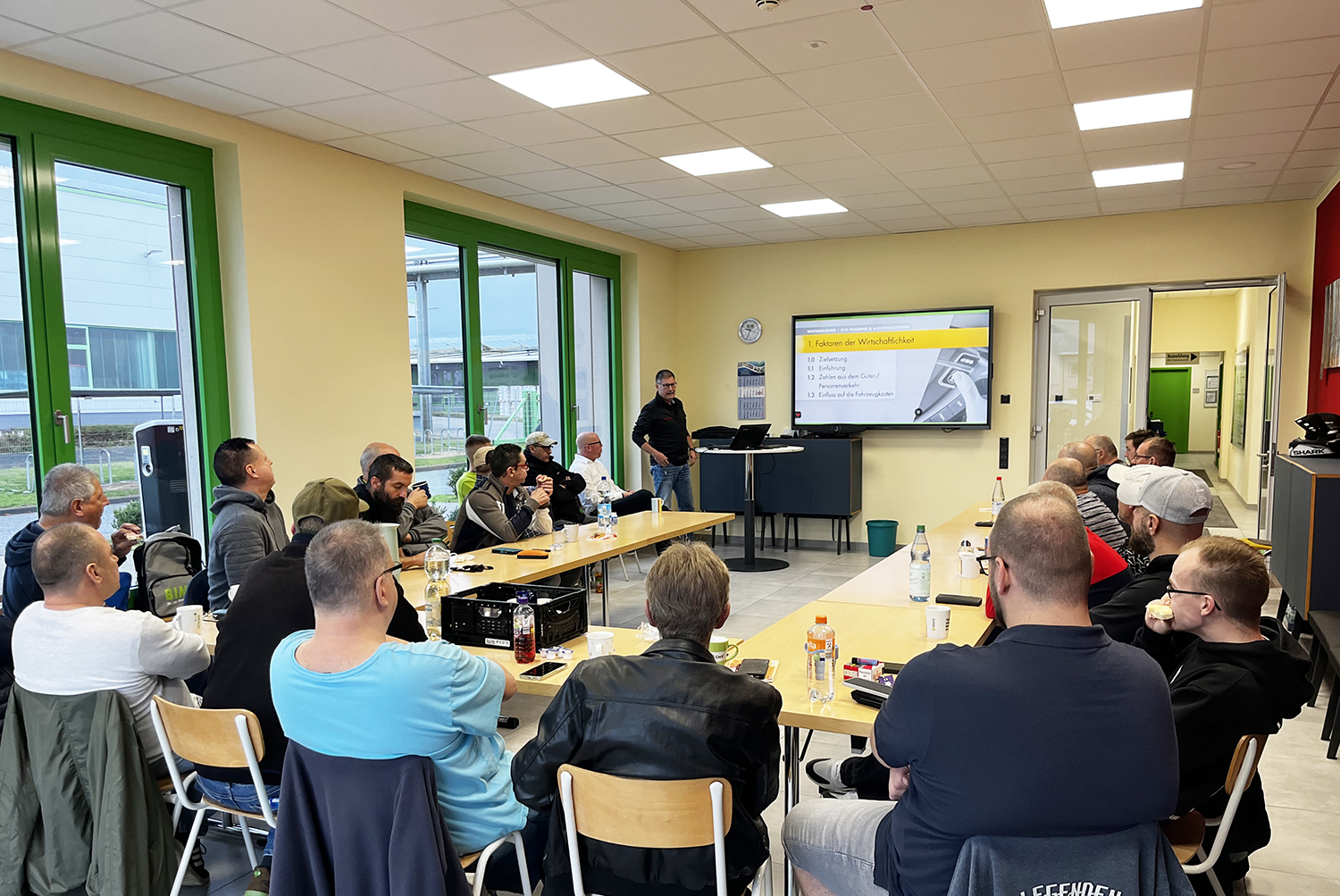 Fuhrparkleiter Jan Schmidt hatte gleich ein ganzes Themenpaket geschnürt. Dazu gehörte das ECO-Training für wirtschaftliches Fahren und Assistenzssysteme mit der Fahrschule Knackert aus Vacha, die jährliche Arbeitssicherheitsunterweisung durch Klaus Brix, unsere Fachkraft für Arbeitssicherheit von Intrasys, und die Schulung zur BIM-Tourenmappe durch den Fuhrpark.